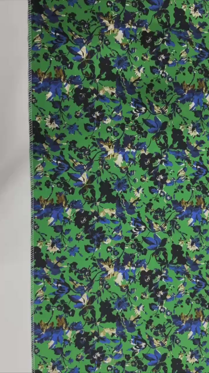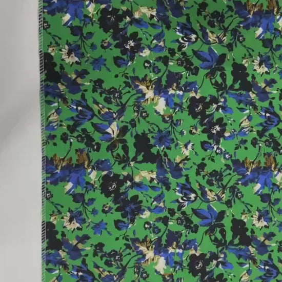 A gorgeous cotton fabric featuring bold blue flowers on a green background, with a colorful border. The print brings out the detail of each blossom, making the fabric ideal for summer wear.