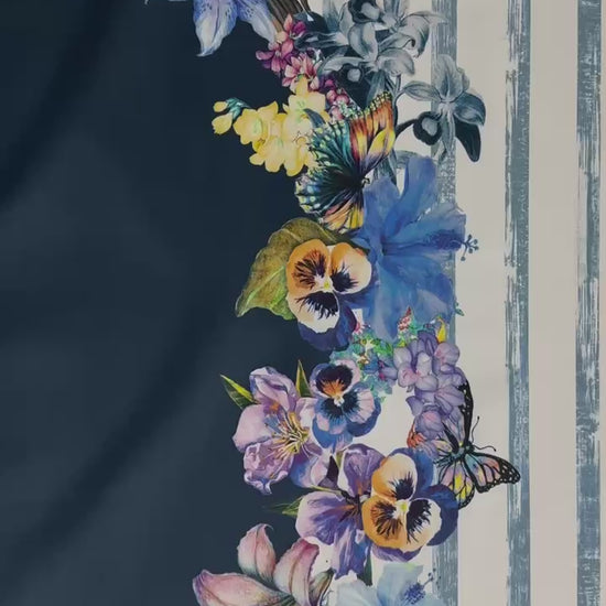 High-quality cotton fabric with a playful floral design on soft stripes. The digital border print runs on both sides and combines floral colors with delicate shades of blue on a creamy white background. Ideal for skirts, dresses, home textiles, and creative DIY projects.