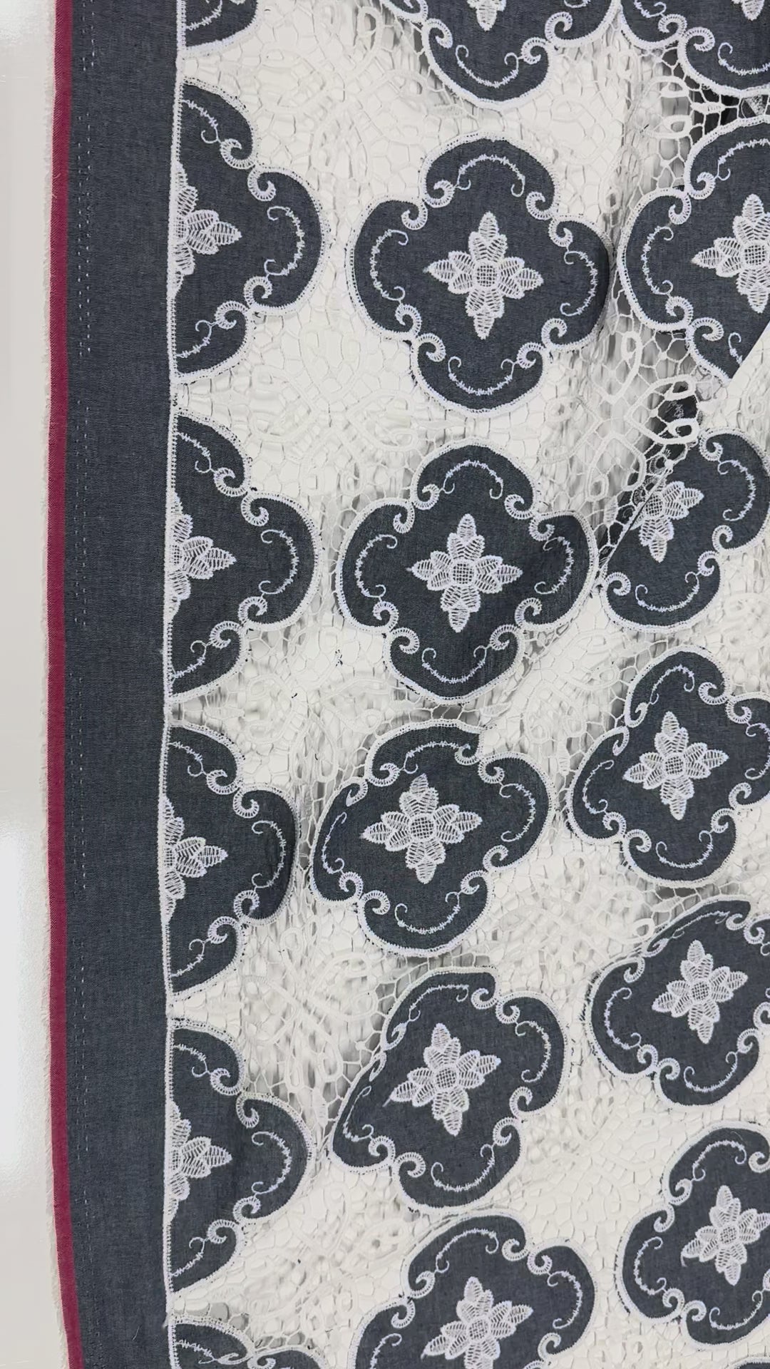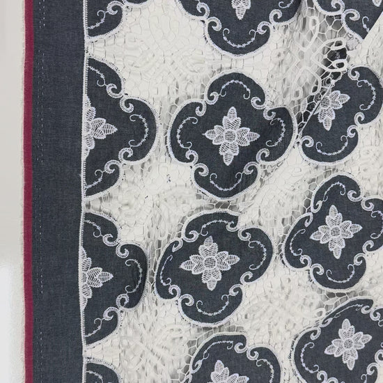 Bereichern Sie Ihr Outfit mit unserer Premium Lochspitze in Navy & Weiß. Die hochwertige Baumwollqualität und die floralen Applikationen verleihen Ihnen einen eleganten Look. Das Denim-Material sorgt für zusätzliche Strapazierfähigkeit. Perfekt für jeden Anlass.