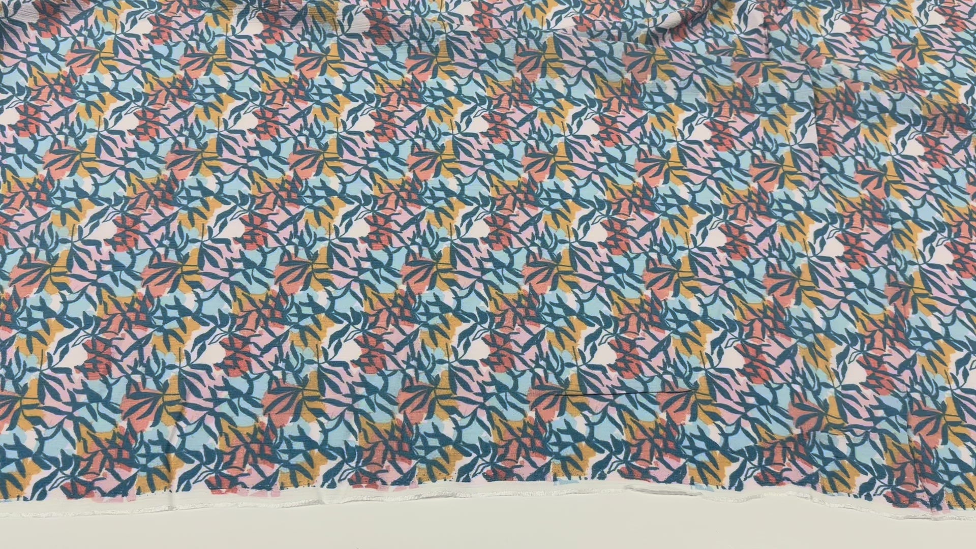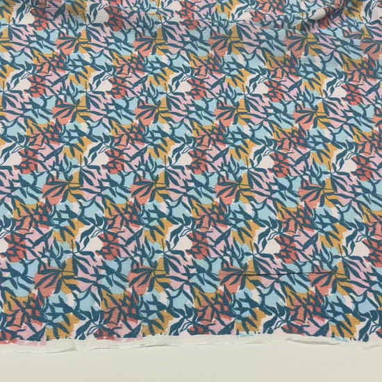 Ein weicher, fließender Viskosestoff mit modernem Blätterprint in harmonischen Farbtönen: Blau, Rosé, Senfgelb und Off-White. Das Muster wirkt lebendig, leicht und perfekt für frische Sommer- und Frühlingslooks.