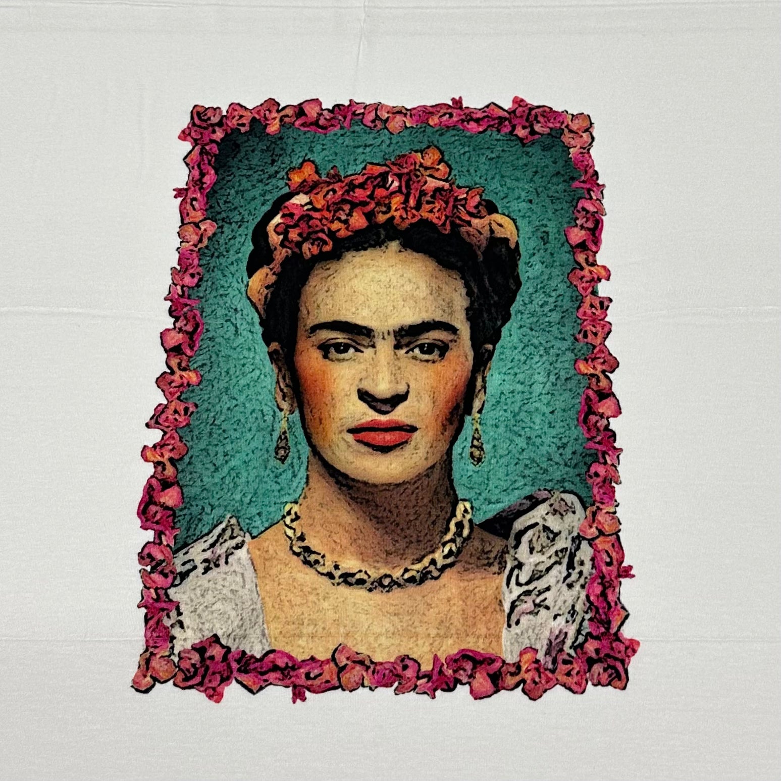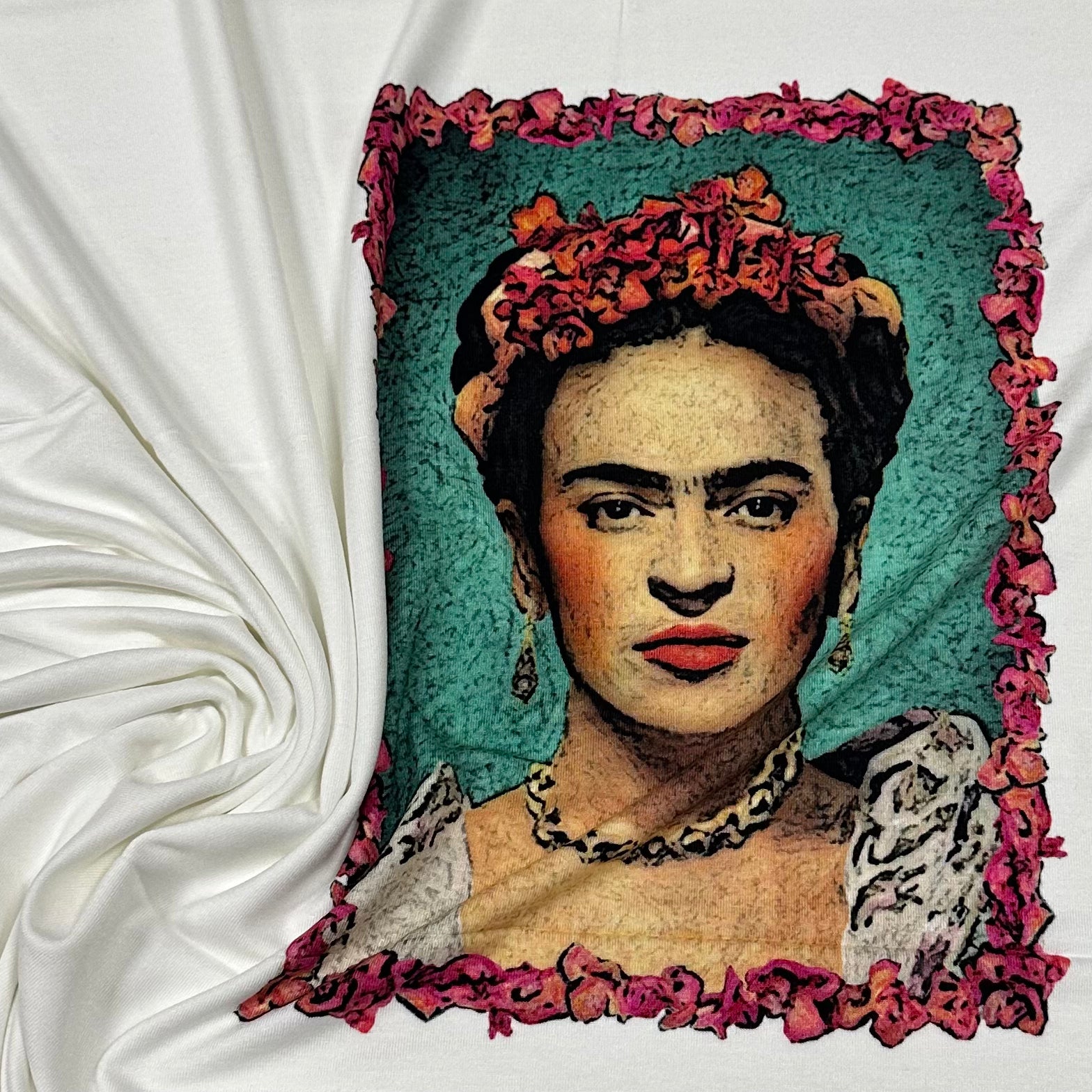 Ein hochwertiges Baumwoll-Panel mit ausdrucksstarkem, künstlerischem Portrait-Design. Umrandet von einem intensiven Blumenrahmen und einem farbigen Hintergrund wirkt das Motiv wie ein handgemaltes Kunstwerk.
