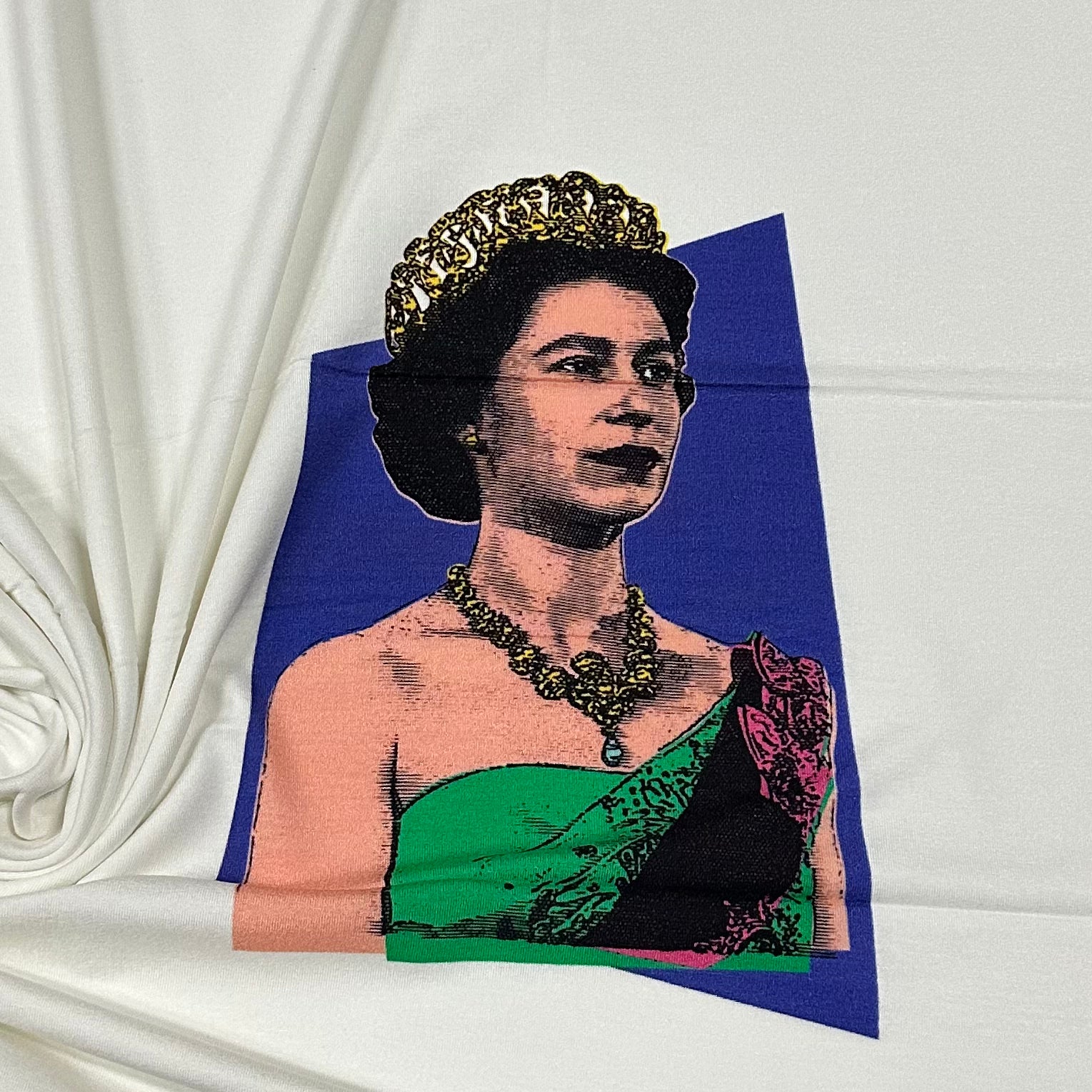 Dieser Panelstoff präsentiert ein majestätisches Portraitdesign auf elegantem blauem Untergrund. Die Viskosefaser bietet optimale Voraussetzungen für hochwertige Kleidungsstücke von fließenden Kleidern bis zu strukturierten Blusen. Der blaue Hintergrund fungiert als subtiler Akzent, der das künstlerische Motiv hervorhebt und gleichzeitig zeitlose Eleganz ausstrahlt. Die ausgezeichnete Drapeierbarkeit und der natürliche Glanz der Viskose verleihen gefertigten Kleidungsstücken eine luxuriöse Anmutung. Ein Material für anspruchsvolle Schneider, die königliche Raffinesse mit praktischer Verarbeitbarkeit verbinden möchten.