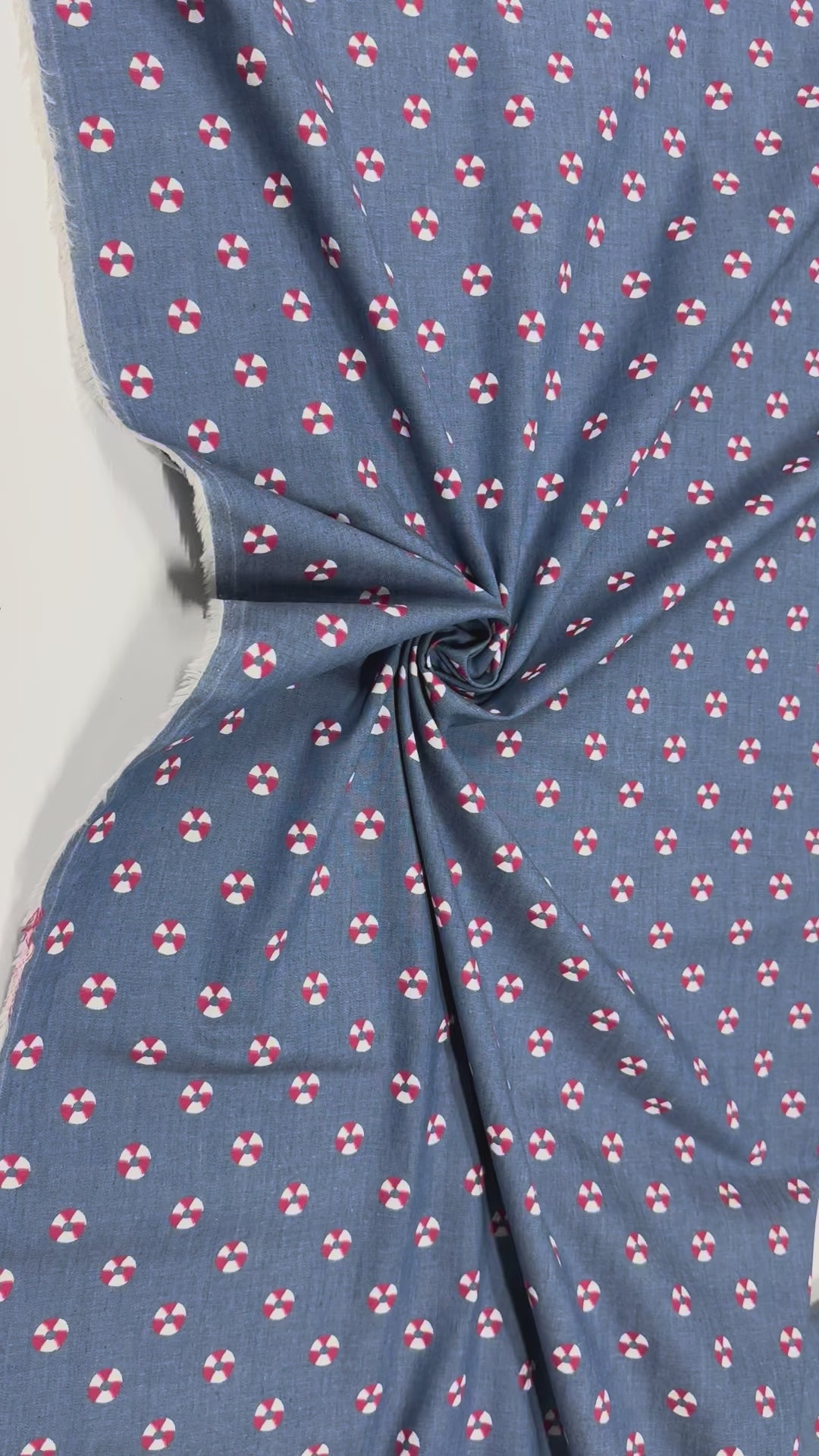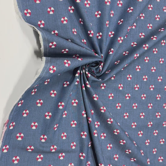 Ein weicher, leichter Denimstoff mit maritimem Rettungsring-Print in Rot, Weiß und Blau. Das Muster erinnert an klassische Nautic-Designs und eignet sich perfekt für sommerliche Mode, Kindermode und kreative DIY-Projekte.