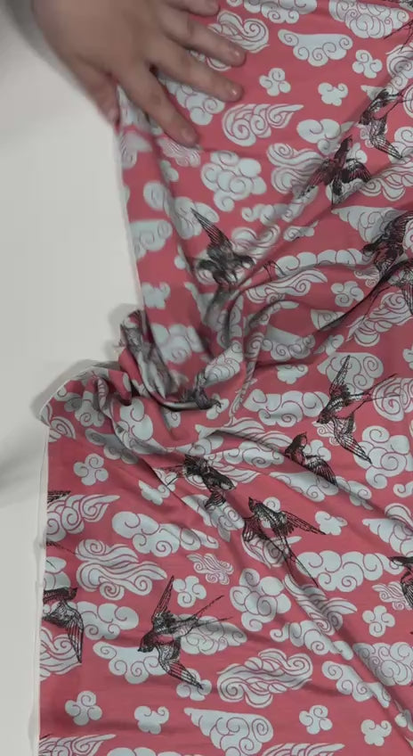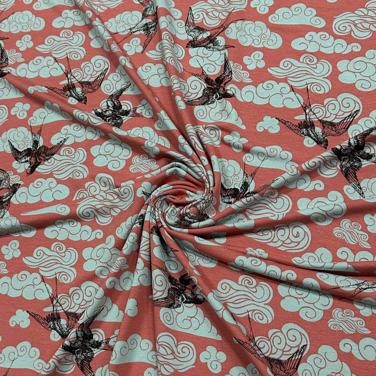 Das elegante Design zeigt filigrane Vögel, die an sanften Wolken vorbeiziehen, und verleiht Ihren Kreationen eine zeitlose, raffinierte Note. Ideal für stilvolle Kleidung und Accessoires, bietet dieser Stoff angenehmen Tragekomfort und fließende Bewegungen. Perfekt für anspruchsvolle Projekte, die Eleganz und Natürlichkeit verbinden.